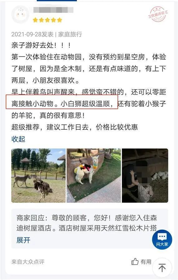 近日,多名网友发文称,江苏南通森迪部落树屋酒店开在野生动物园里,入住后,住客可以随意撸狮子、老虎。