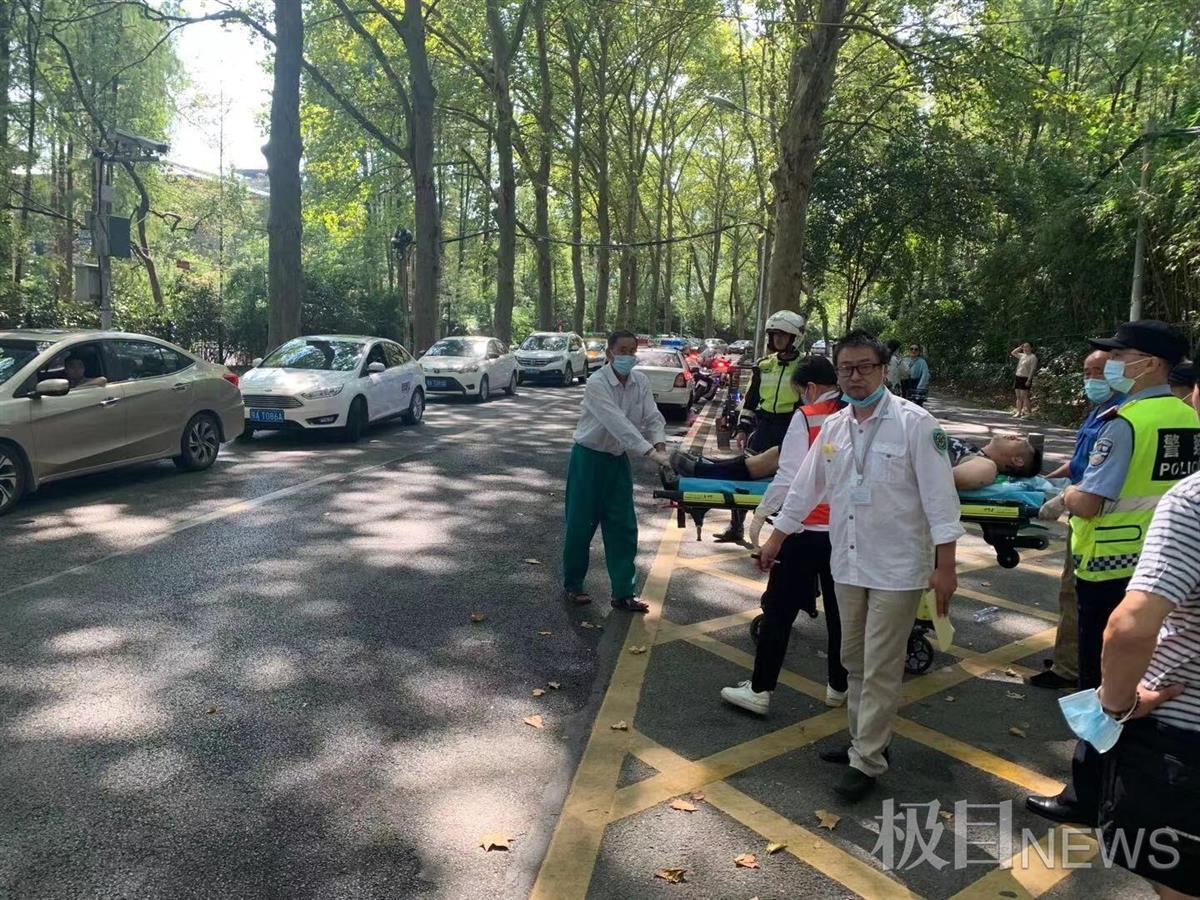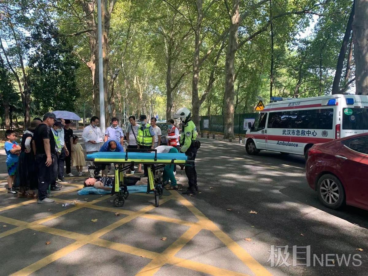 国庆节期间,在武汉东湖风景区内,一名跑步者突发疾病,倒地抽搐。闻讯赶来的两名民警立即展开施救,并驾驶警用摩托车打开了一条“生命通道”。
