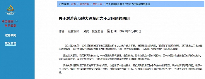 针对网传“四川甘孜稻城亚丁景区有游客聚集,疑似出现滞留”,四川甘孜稻城亚丁景区官方网站发布关于对游客反映大巴车运力不足问题的说明:10月3日20时许,游客反映稻城亚丁景区扎灌崩乘车点大巴车运力不足、滞留至深夜的问题。稻城亚丁景区管理局、亚丁旅发公司高度重视游客诉求,全力安排运力将等候游客于21时前全部组织上车,并安全送出景区。所反映“滞留深夜”等问题不属实。