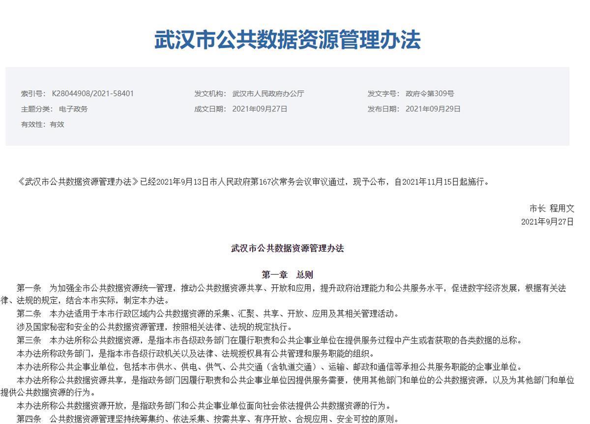 打破数据系统“信息孤岛”,让数据多跑路,让群众少跑路。近日,武汉市政府出台了《武汉市公共数据资源管理办法》,对公共数据资源共享、开放和应用作出明确规定。该办法将于2021年11月15日起施行。