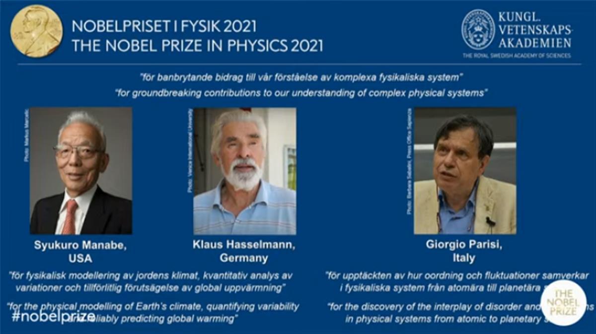 刚刚,瑞典当地时间10月5日中午12点,诺贝尔奖委员会正式宣布,获得2021年诺贝尔物理学奖的是,美籍日裔的syukuro manabe,德国的klaus hasselmann以及意大利的Glorglo parisl,以表彰其在理解复杂物理系统方面的开创性贡献。