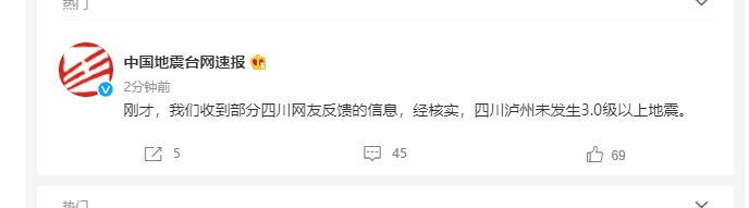 5日晚9时51分,中国地震台网速报称:“刚才,我们收到部分四川网友反馈的信息,经核实,四川泸州未发生3.0级以上地震。”