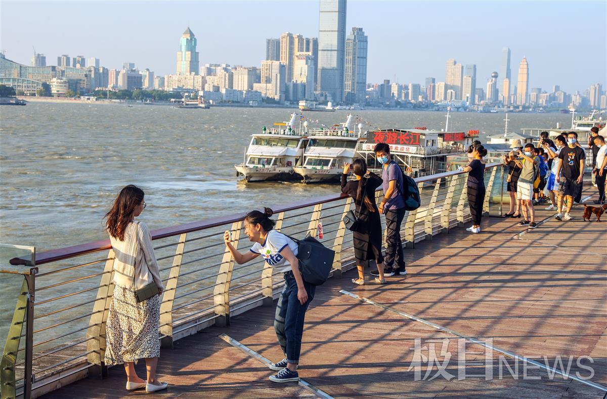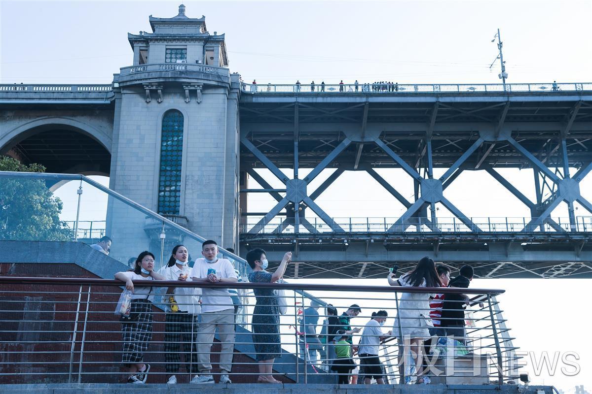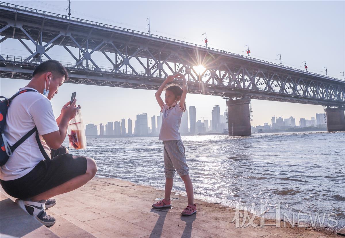 在武昌长江汉阳门码头,不少市民游客欣赏、拍照江上夕阳好风光:“一道残阳铺水中,半江瑟瑟半江红”。