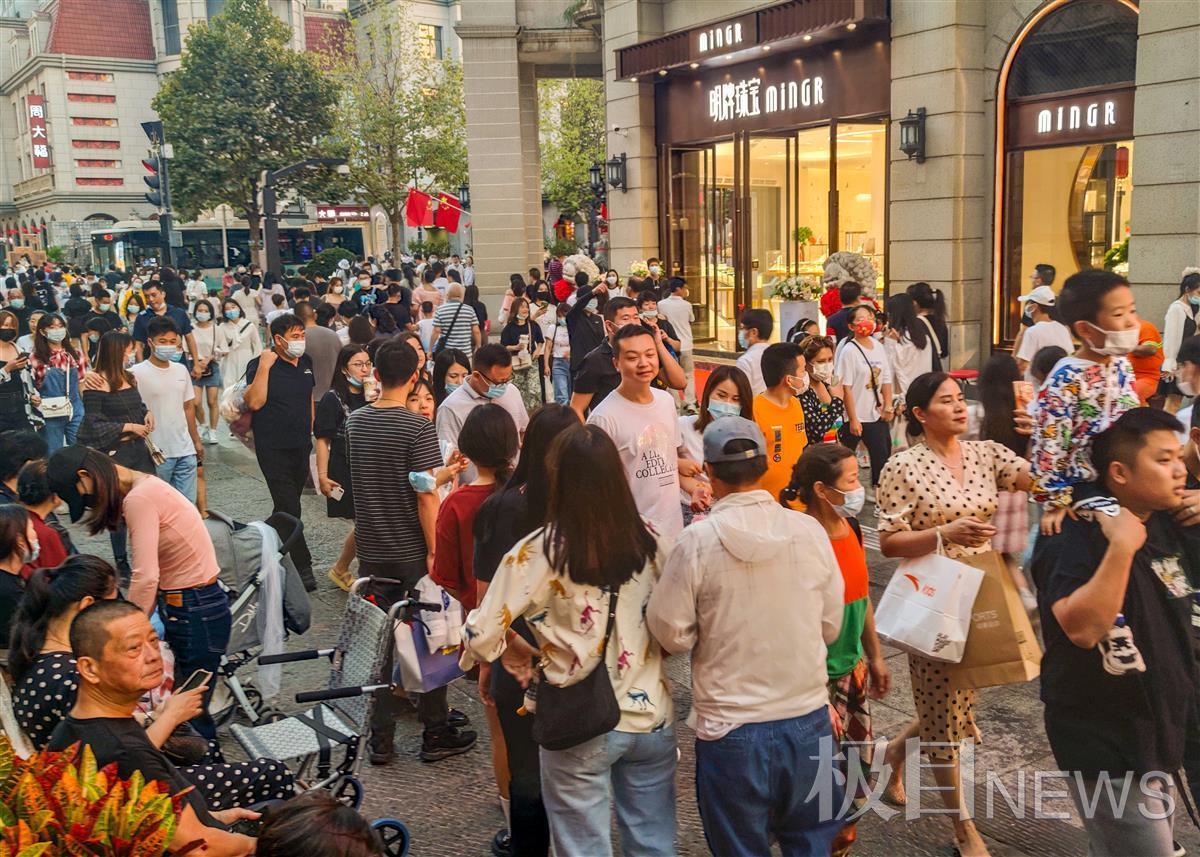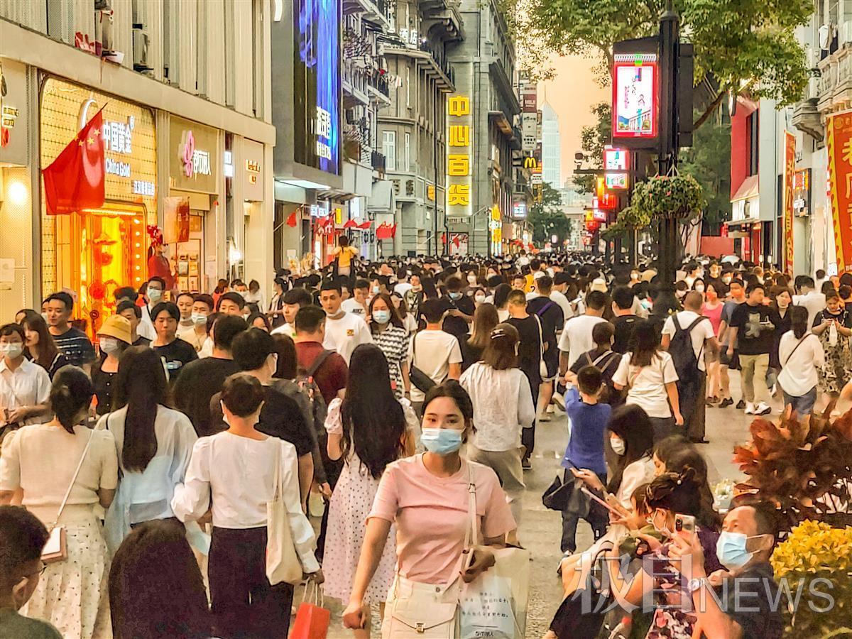 在汉口江汉路步行街上,秋风带来的爽秋之夜色,游客如潮。