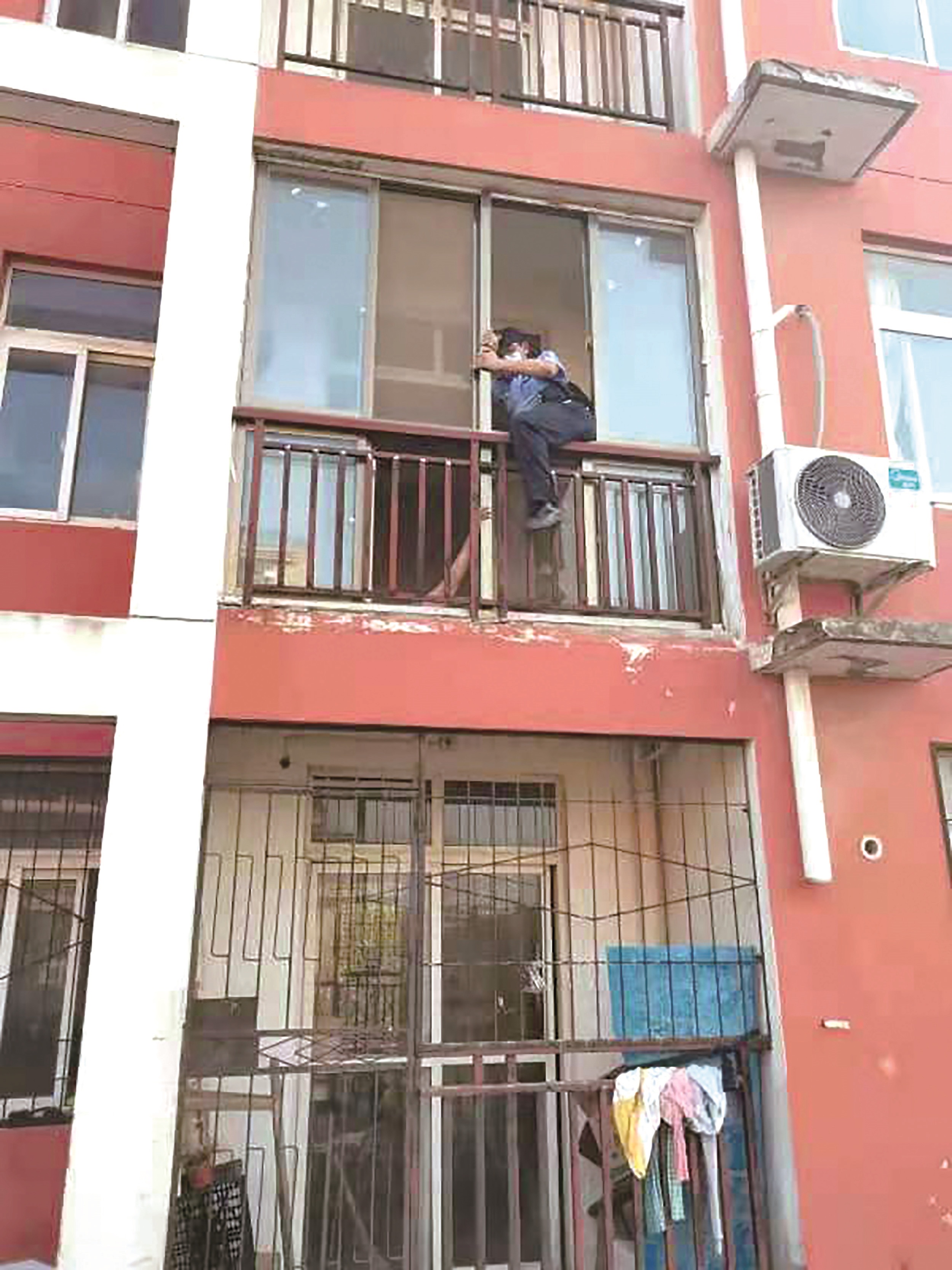 情况紧急,打开房门救援时间太长。民警观察地形,发现婆婆家中阳台没有完全封闭,于是迅速从二楼住户家中沿着二楼阳台防护网,徒手攀爬上了三楼,翻窗进入婆婆房内。