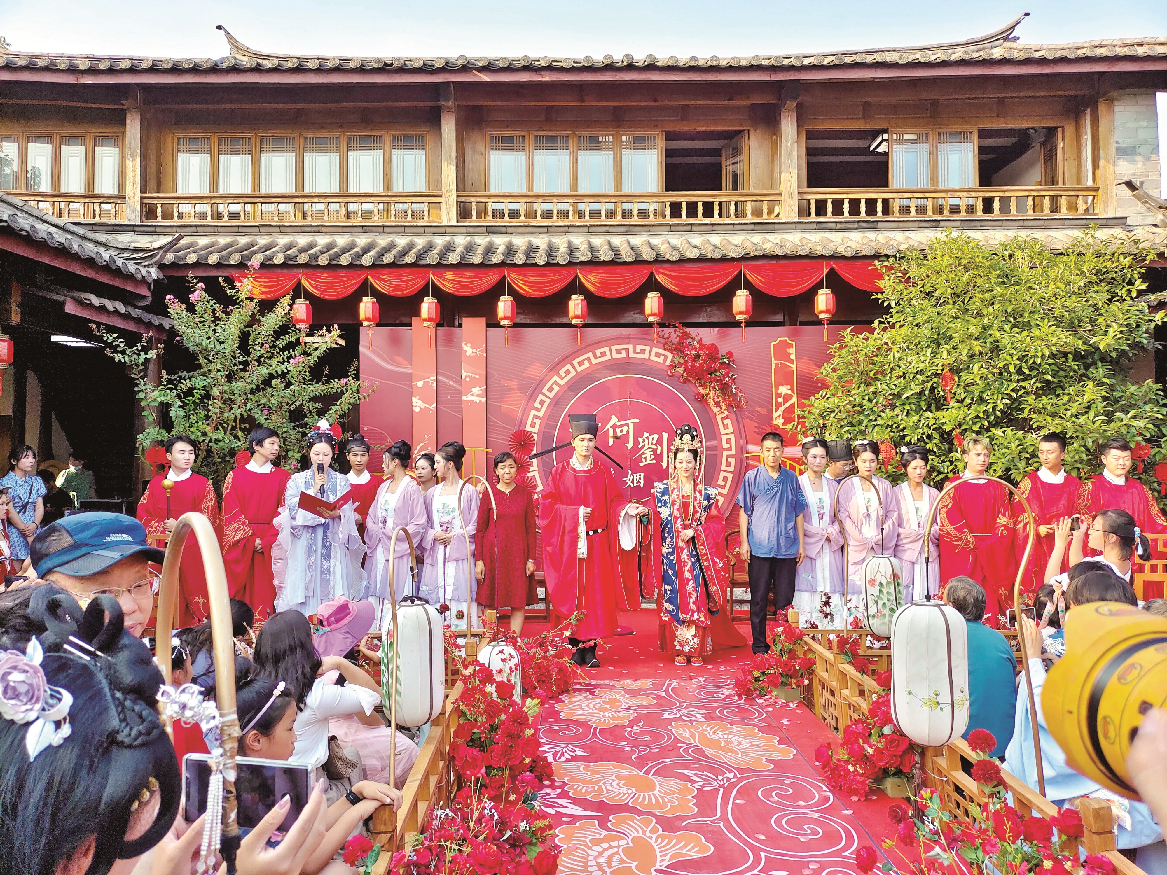 国庆长假,一群汉服爱好者在武汉园博园还原宋朝的婚礼。扮新郎的刘鼎立来自甘肃、扮新娘的何雪银来自重庆,他们演绎了大气庄重的传统婚礼仪式,吸引众多游客拍照。