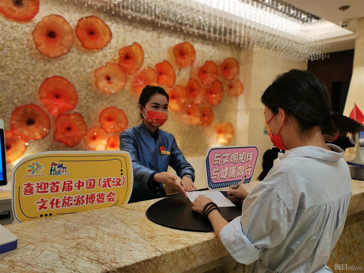 来自湖南的宾客刘先生,刚刚停车抵达洪山宾馆,工作人员熊超就协助提行李、验绿码、测体温,前台工作人员李盼盼热情地办理入住,整个过程高效、热情,让客人感到像回家一样。同时,酒店还为每一位外地客人赠送了“武汉热干面”。
