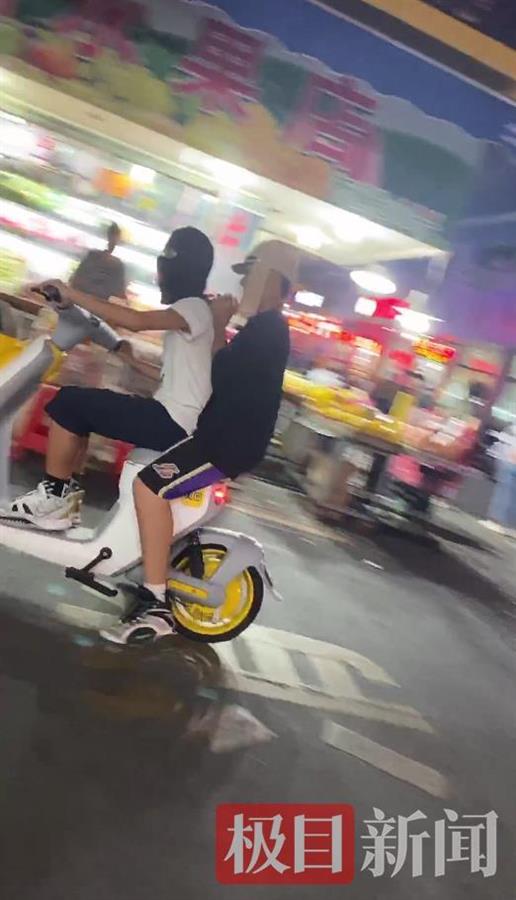 网传视频中,两男子骑着电动车,前面男子带着黑面罩,只露出眼睛嘴巴,后座上的男子戴着一顶日本军帽,还回头对视频拍摄者说话。