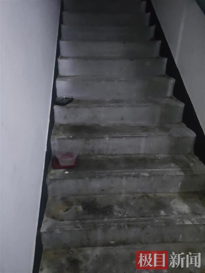 由于楼梯间没有窗户,整个楼道显得昏暗、潮湿。记者发现垃圾桶都没有装满,但楼梯间以及上下楼梯的地面上均留有不少油污和水迹。在1号楼10楼,记者看到,楼梯上摆放着几个一次性塑料碗,里面分别装着水和一些饭菜。