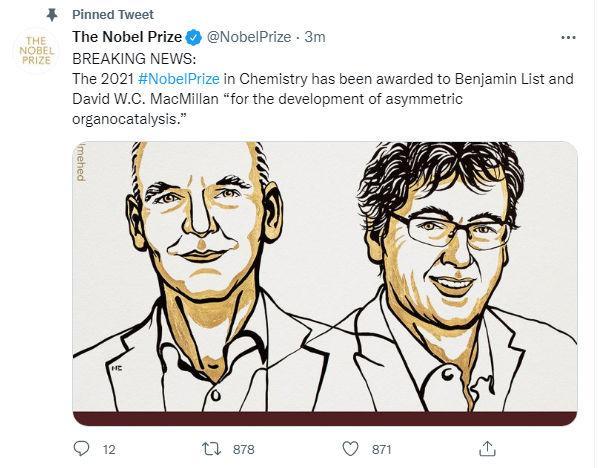 中新网10月6日电(张奥林)据诺贝尔奖官网消息,北京时间6日下午,2021年诺贝尔化学奖揭晓,美国科学家David MacMillan和德国科学家Benjamin List因“在不对称有机催化研究方面的进展”被授予该奖项。