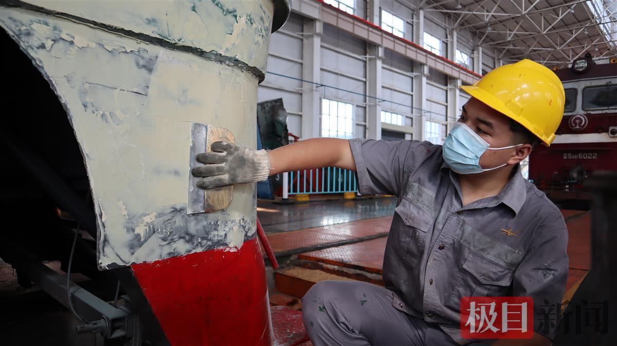 90后小伙褚恒,去年9月刚刚参加工作,他和师傅程世辉正在给东风4型9423号机车刮腻子、打磨、喷漆。