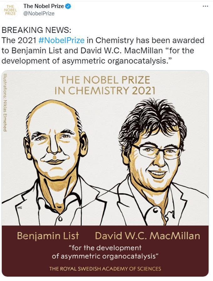 据诺贝尔奖官网消息,2021年诺贝尔化学奖的评选结果于北京时间10月6日17时45分许揭晓,瑞典皇家科学院宣布,该奖项由德国科学家本亚明·利斯特(Benjamin List)和美国科学家戴维·麦克米伦(David W.C. MacMillan)获得,两人因在“有机小分子不对称催化”方面做出的重要贡献而被授予2021年诺贝尔化学奖。