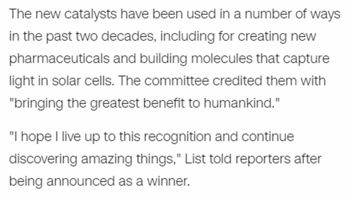 据了解,在过去的20年间,这种新型催化剂已经被应用到了不少领域,包括用于制造新药和在太阳能电池中捕捉光的分子。诺贝尔化学奖委员会称赞他们二人“给人类带来了巨大的利益”。