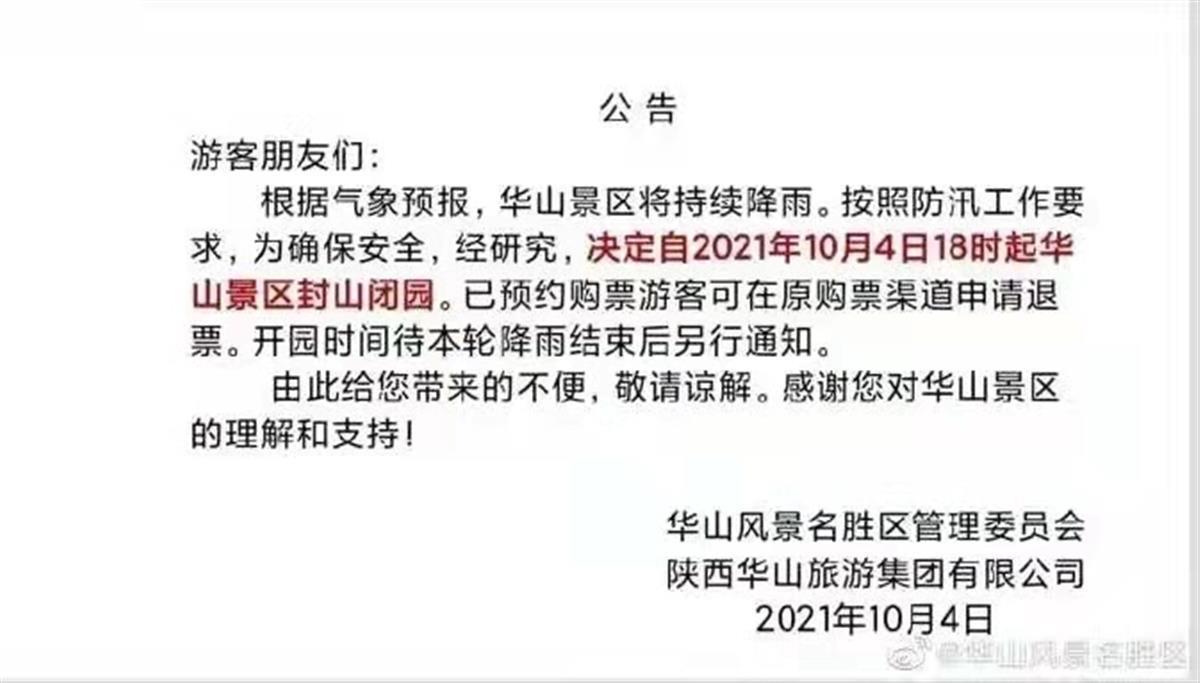 张女士表示,4日下午刚到华山时,天空灰蒙蒙的还下着小雨,但这没有影响一行人的心情。她在山脚下的酒店安顿好家人,原计划5日一大早进入景区爬山,结果从酒店前台服务员处听到华山要临时闭园的消息。张女士查询景区官方消息、咨询工作人员后才得知,华山景区自4日18时起封山闭园。无奈之下,张女士只好选择退票。