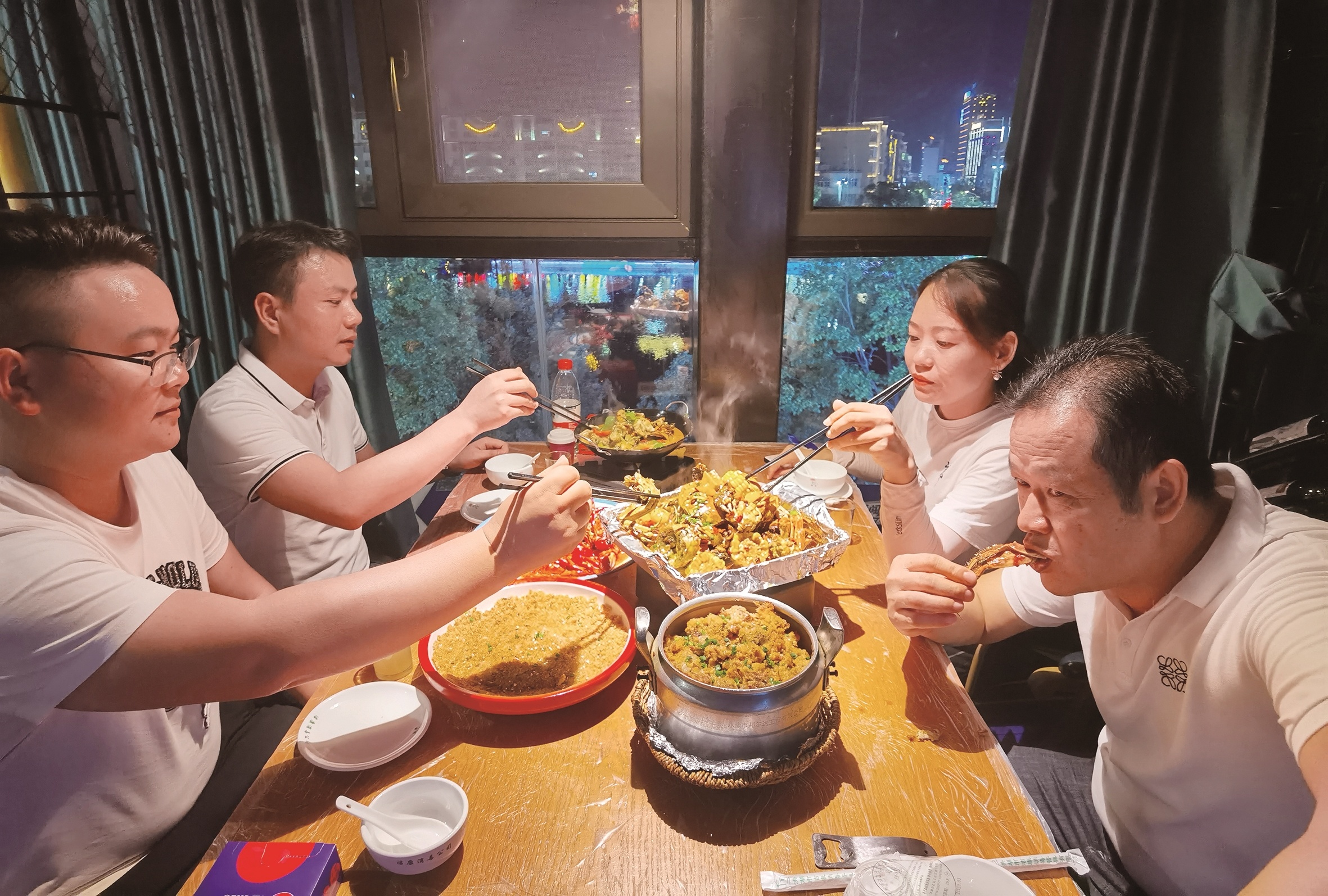 在餐馆二楼一间临河的包间,肖先生一家四口正津津有味地品尝着一大锅香辣蟹。肖先生的小女儿手里拿着蟹腿笑着说:“我不怕辣,吃不完会打包带回家。”