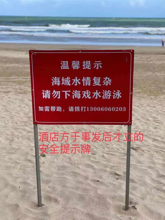 不过,博鳌道纪海景大酒店运营总监在接受当地媒体采访时表示,海滩离酒店有几百米远,属于公共海滩,酒店里里外外均有告示牌,沙滩上也有政府的告示牌,提醒客人不要下海游泳。
