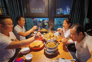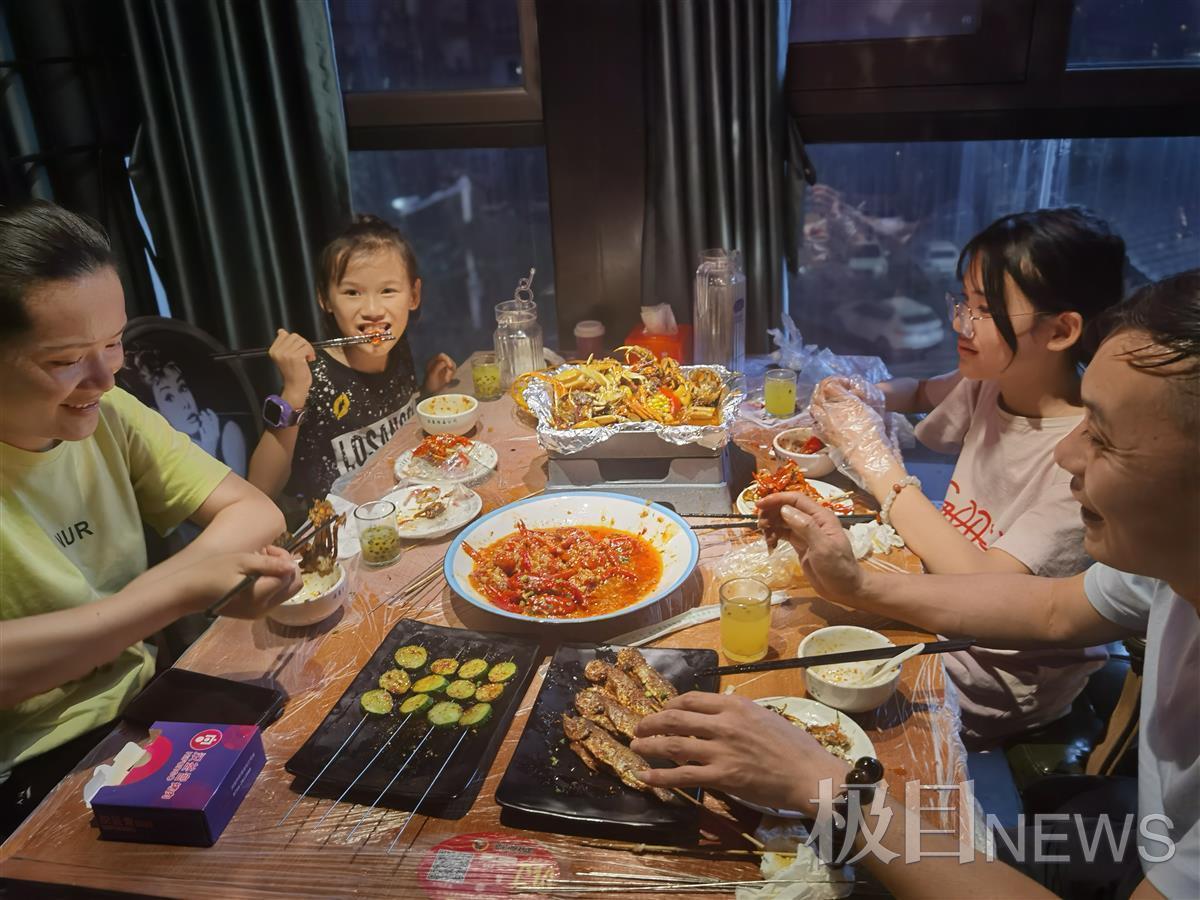 在餐馆二楼一间临河的包间,肖先生一家四口正津津有味地品尝着一大锅香辣螃蟹。肖先生的小女儿手里拿着螃蟹腿笑着说,“我不怕辣,吃不完会打包带回家吃。”