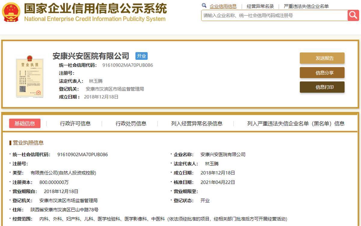 国家企业信用信息公示系统显示,安康兴安医院有限公司成立日期为2018年12月18日,注册资本800万元,其经营范围包括内科、外科、妇产科、儿科、医学检验科、医学影像科、中医科(依法须经批准的项目,经相关部门批准后方可开展经营活动)。