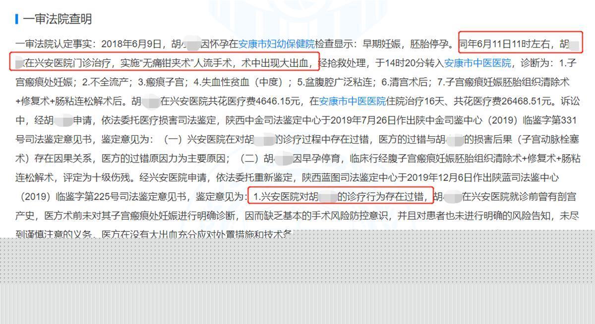 天眼查显示,就在去年,该医院曾因医疗损害责任纠纷而被起诉。中国裁判文书网显示,2018年6月9日,一患者胡某某因怀孕在安康市妇幼保健院检查显示:早期妊娠,胚胎停孕。同年6月11日11时左右,胡某某在兴安医院门诊治疗,实施“无痛钳夹术”人流手术,术中出现大出血,经抢救处理,后转入安康市中医医院。