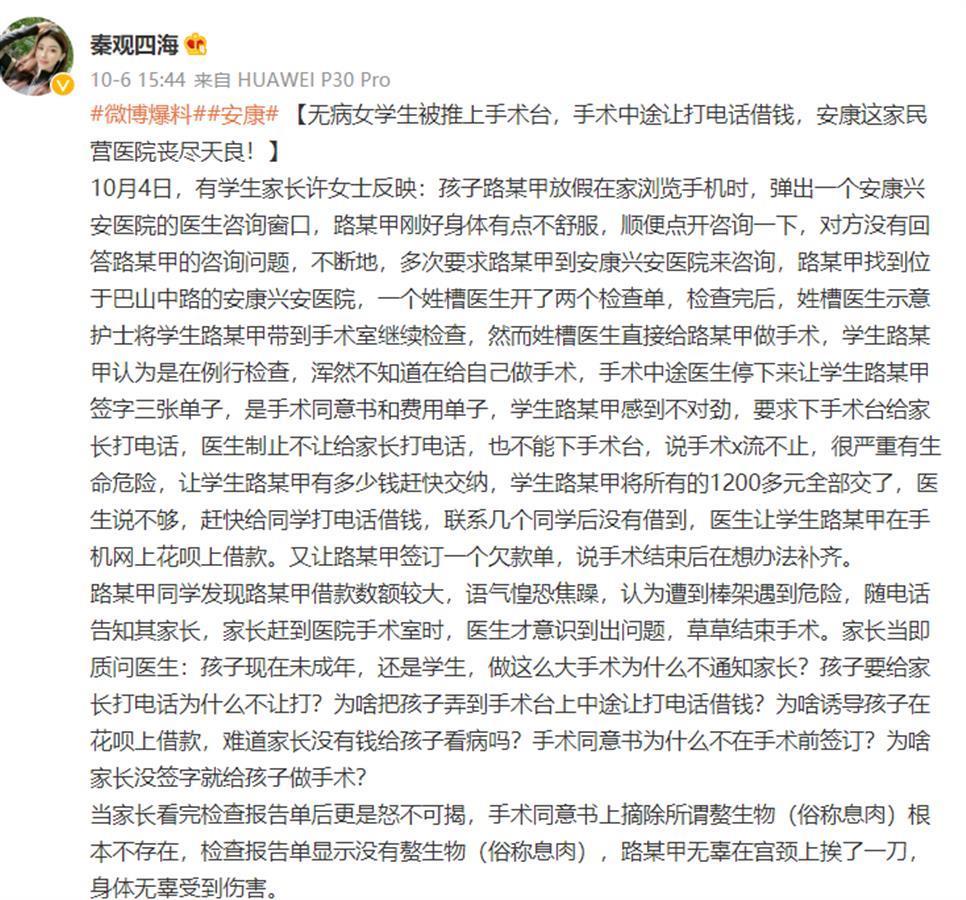 10月6日下午,微博网友“@秦观四海”爆料称,10月4日,陕西安康一名未成年女学生小月(化名)因身体感到有些不适,在当地一名为“安康兴安医院”的民营医院就诊时被推上手术台,手术途中,医生让小月签手术同意书和费用单,并在该女生身上钱不够时,让其打电话借钱,在花呗上借款,签订欠款单。家长得知后赶到医院,却发现该院的检查单中并无医生所说的病症。次日,家长带孩子在安康当地一公立医院检查时发现,上述民营医院检查单上的病症也不存在。