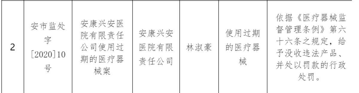 此外,极目新闻记者查询发现,安康市市场监督管理局网站于2020年12月曾公示了一份行政处罚信息公开表,其中,安康兴安医院有限责任公司因使用过期的医疗器械,被给予没收违法产品、并处以罚款的行政处罚。