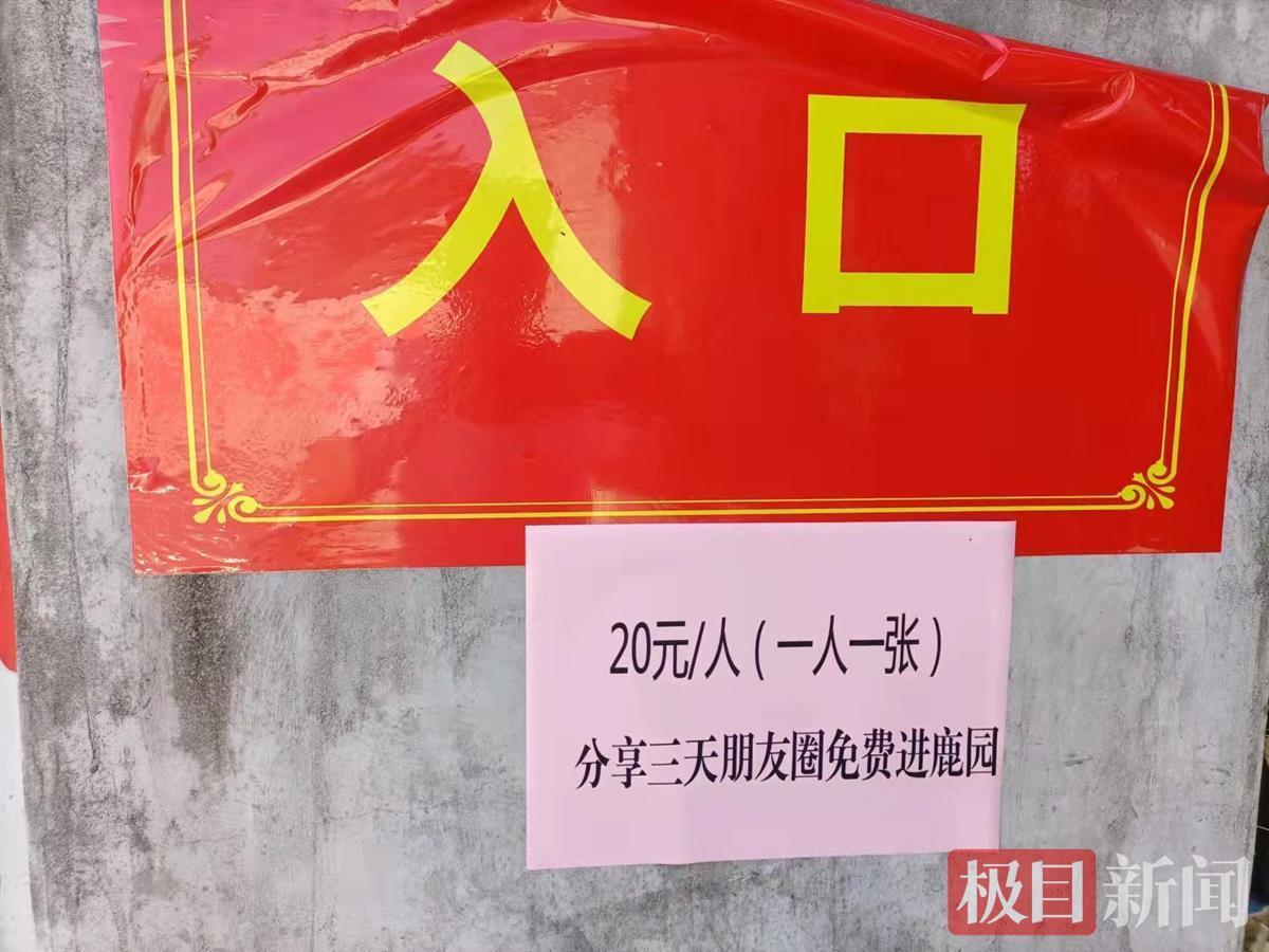 大门口张贴着的一张红色“入口”指示牌下,一张小纸仍贴在上面,写有“20元一人,一人一张,分享三天朋友圈免费进鹿园”等字样。记者试图进入到里面,但敲门时,里面却无人应答。