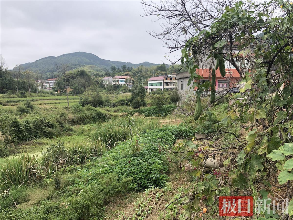 这是一个位于大别山余脉的小山村,远处青山起伏连绵,近看田野间一片丰收景象,丝瓜豆角满架挂,待割的稻谷泛金黄。