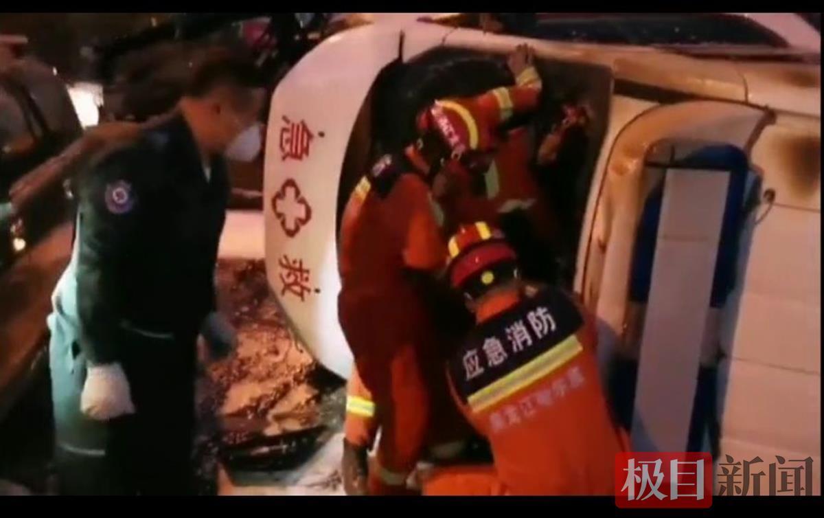 哈尔滨市消防救援支队工作人员称,8日4时31分许指挥中心接到报警称,松北区利民大道朱家桥下发生交通事故有人员被困,随即指挥中心调派学院路消防救援站出动5辆消防车14名指战员赶赴现场。救援人员抵达现场,经现场勘查发现,一辆急救车与道路隔离石墩发生碰撞后再次与行驶中的私家车发生二次碰撞,救护车发生侧翻且油箱发生泄漏导致车辆燃烧,车内2名人员被困,情况十分紧急。哈尔滨市消防救援支队救援人员立即反应,迅速处置,一支泡沫水枪覆盖灭火,一支泡沫水枪控制流淌火以防发生蔓延,一支水枪掩护救援人员抢救被困人员。在救出第一名被困者后,发现另一名被困人员身体被卡住,救援人员立即使用液压破拆组合工具对车辆进行破拆。5时5分许,成功将第2名被困人员救出,两名被困人员移交120救护车送往医院进行救治。