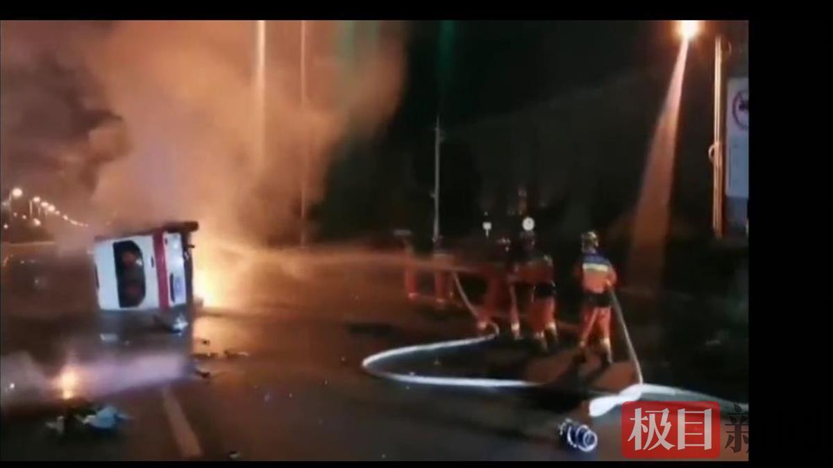 当地居民提供的视频显示,一辆SUV车横在道路中间,不远处一辆救护车侧翻在车道上,车头部位正起火。还有视频显示,消防人员正在施救,救护车车头上有“急救”二字。