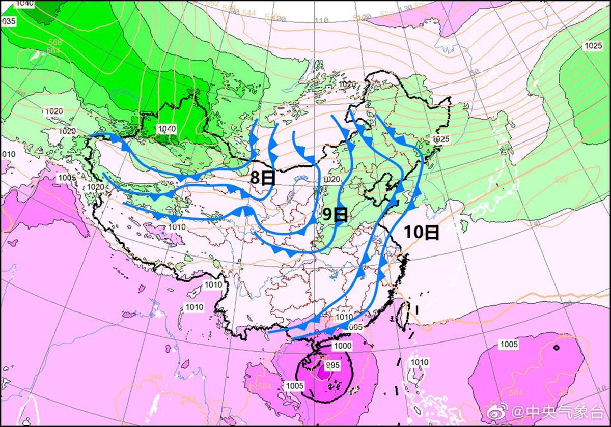 中央气象台预计,8日至11日这股冷空气自西向东影响我国大部地区,气温将下降4℃-6℃。