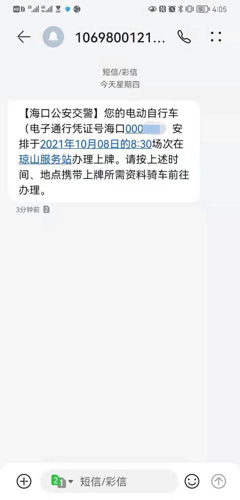 海口公安交警温馨提示:通过手机短信分批次通知车主在规定时间前往指定地点办理车辆注册登记,请广大电动自行车车主保持手机通信畅通。同时,车主可通过“椰城交警”微信公众号查询注册登记具体时间、地点。如遇特殊情况无法按照指定时间注册登记的,可通过“椰城交警”微信公众号自主选择周六上午预约办理。电动自行车办理注册登记过程,免费拓印、拍照、验车、安装号牌,车主可自愿选择购买保险。在驾驶电动自行车前往办理注册登记时,应自觉佩戴安全头盔,确保安全出行。
