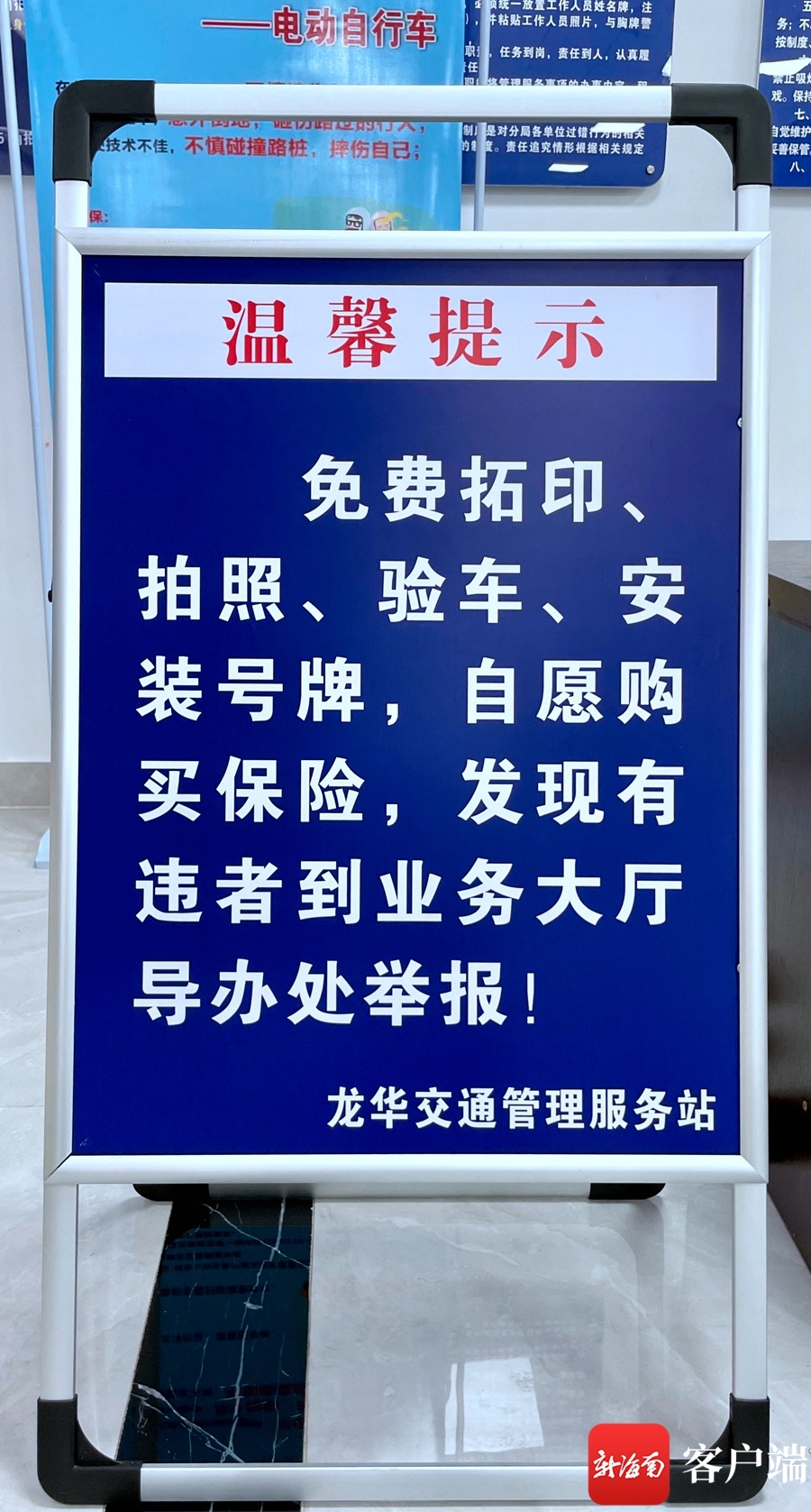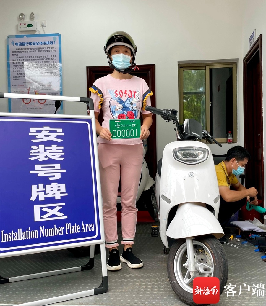 10月8日上午,市民李女士在龙华交管服务站通过车辆查验、业务受理录入等流程,领取到“海口000001”的新国标电动自行车号牌,并进行安装。整个办理注册登记的过程在20分钟内便可完成。