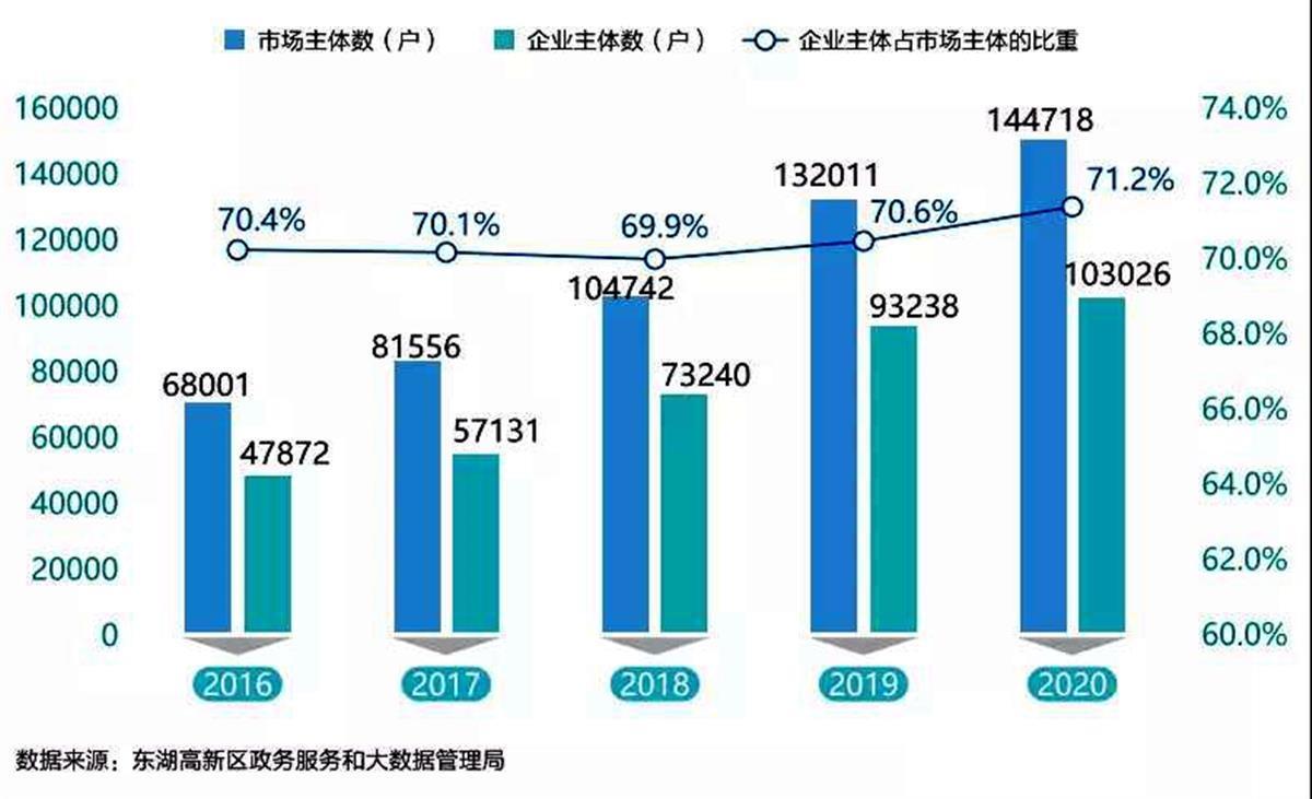 年轻人友好之城,造就自主创新高地。2020年,东湖高新区地区生产总值总量及增幅、高新技术产业增加值、进出口总额、实际利用外资总额等多项核心经济指标均居全市各区第一,贡献了全市12.8%的地区生产总值和27.3%的高新技术产业增加值。另外一方面,2020年东湖高新区各类市场主体总量达14.5万户,其中企业主体超过10万户,高新技术企业总数达3146家,总数居全国高新区第五位、中部地区第一位。