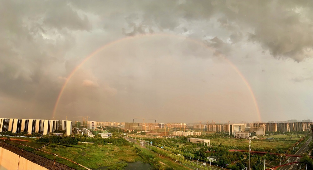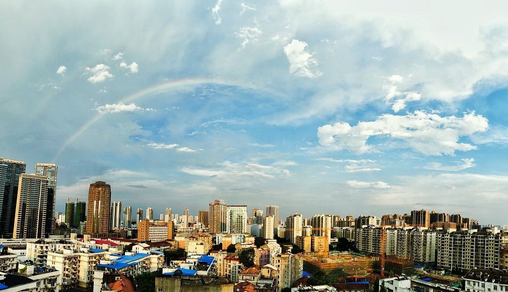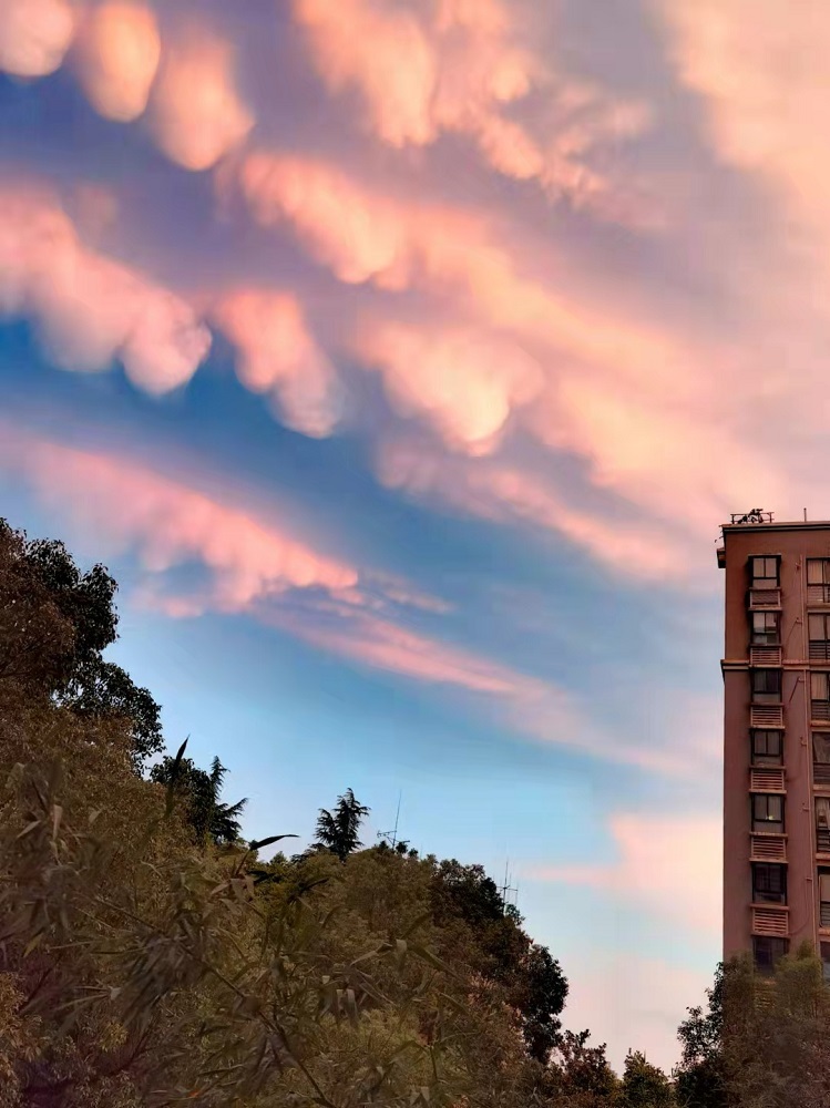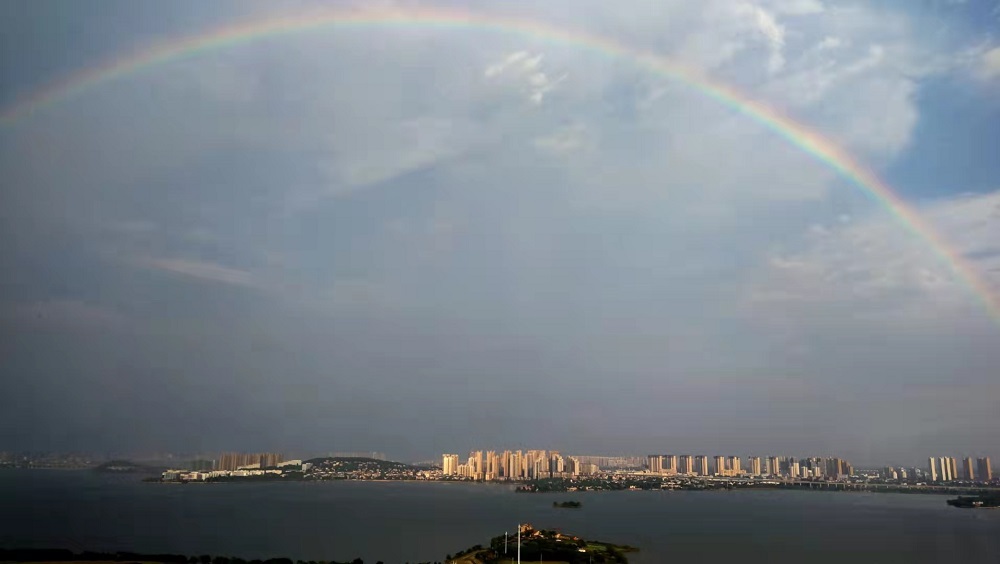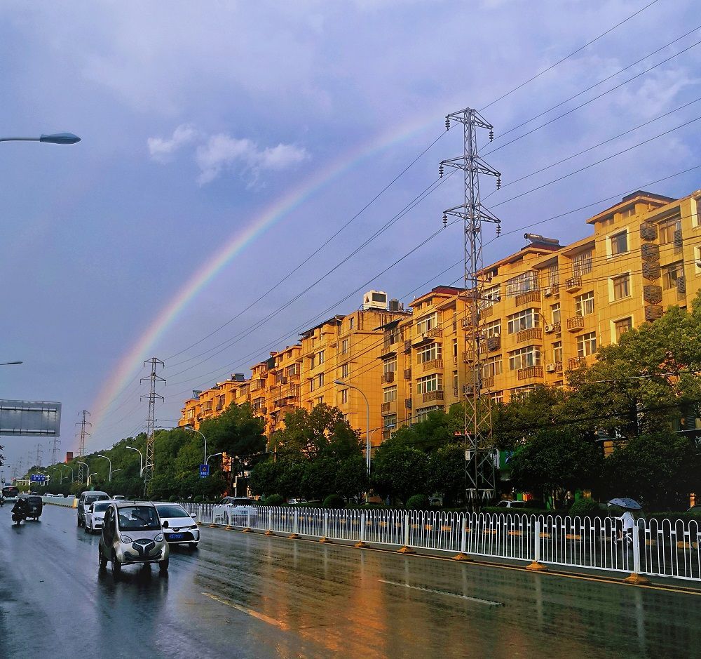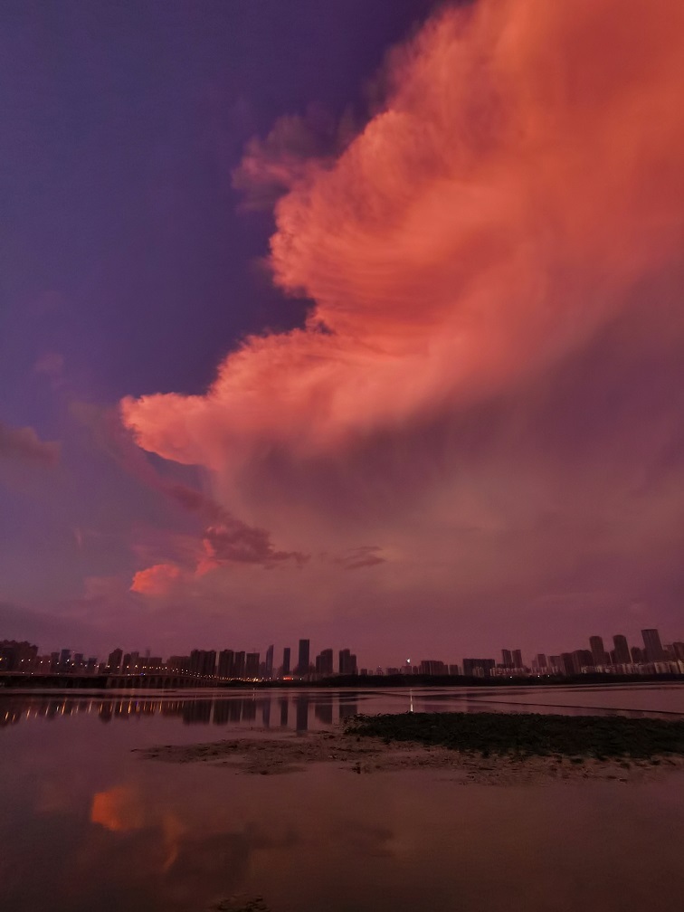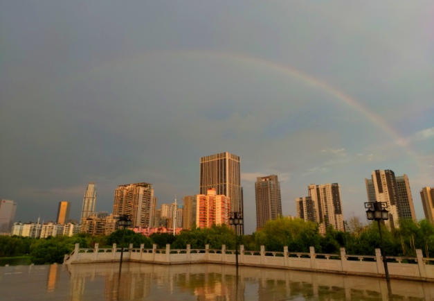 下午6时左右,急雨停歇,彩虹出场,在城市的各个角落,彩虹一半没于天际,一半挂在楼顶、树梢、江面。没赶上彩虹的也别遗憾,接下来的火烧云非常惊艳,巨型火烧云占据半边天空,散发出柔和的粉红色光芒,把整座城市变成了一座粉红之城。