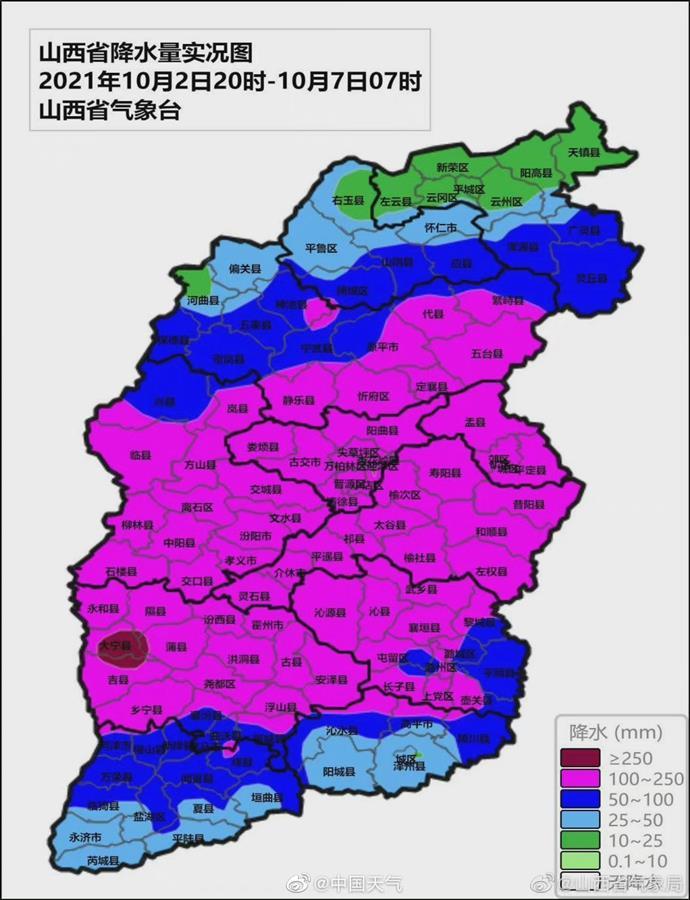 山西省2日至7日降水量实况图(图源:中国天气微博)