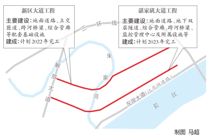 谌家矶大道是连接长江新区与汉口主城区的快速通道,线路全长4.7公里,西起解放大道,东至三环线,沿线下穿沪汉蓉高铁、京广铁路,上跨朱家河,工程主要建设地面道路、地下双层隧道、综合管廊、跨河桥梁、监控管理中心及附属设施等。项目计划2023年完工,届时,市民从解放大道穿长江新区至三环线,仅需约5分钟车程。
