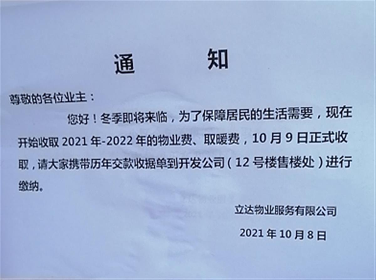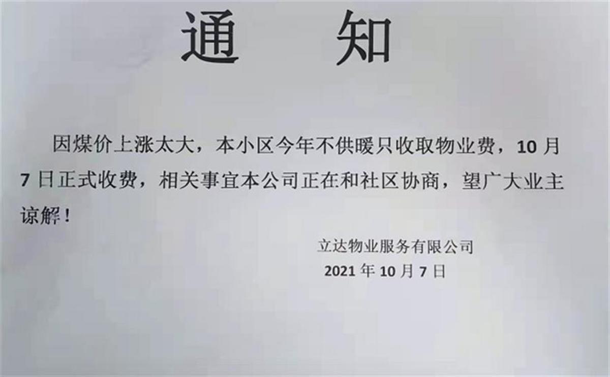 10月7日,葫芦岛市一小区物业公司发布通知称,因煤价上涨太大,本小区今年不供暖只收取物业费,10月7日正式收费,相关事宜本公司正在和社区协商,望广大业主谅解。该通知落款为立达物业服务有限公司。此通知一出,引发小区业主和网友热议。有网友评论称,“真刚,东北冬天不供暖怎么过?不供暖,老人小孩怎么受得了。”