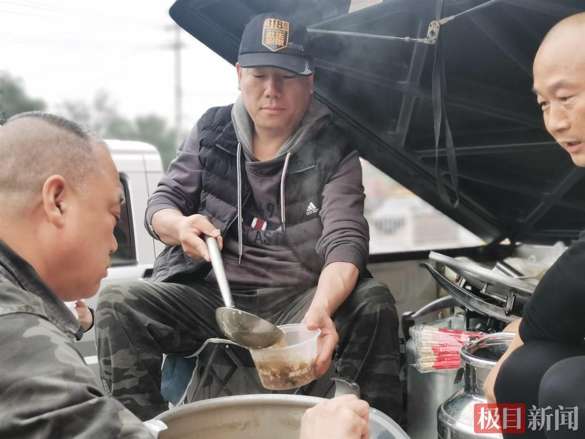 11时30分左右,一辆大型皮卡车拖着几桶食物来到交警执勤点,给交警送来爱心午餐。之后,他们涉水通过积水较深道路,继续给堤坝上的工作人员送餐。