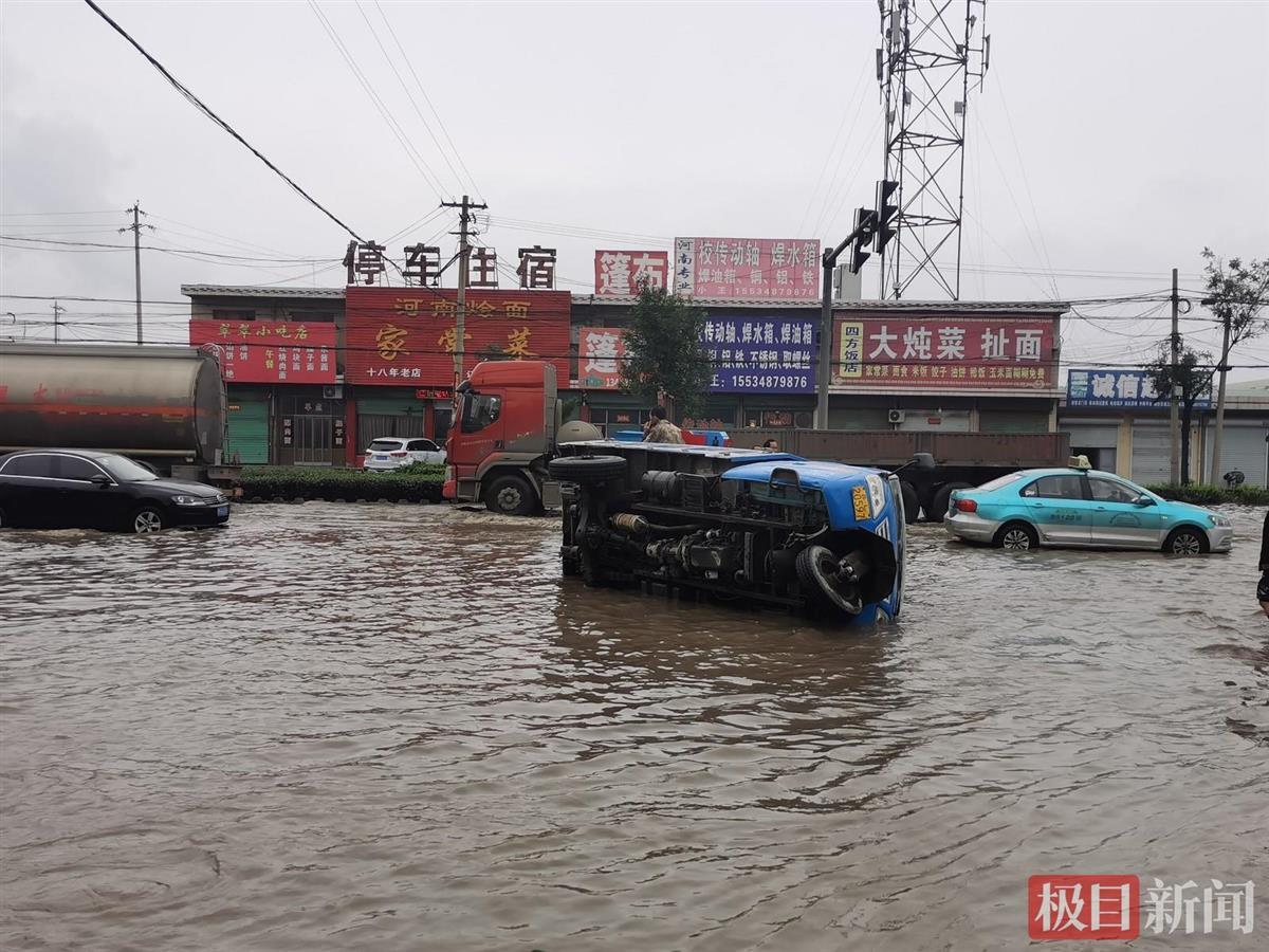 期间因路口积水处有坑洼,一辆三轮车翻倒在水中,所幸司机无恙。