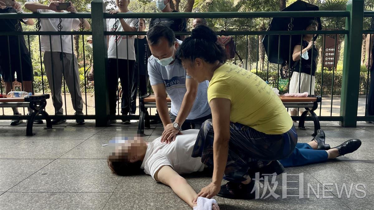 公园安保队长杨运动蹲下触摸游客颈动脉,发现无搏动。通过观察,发现女游客胸腔无起伏,脸色苍白,浑身湿冷,已休克。