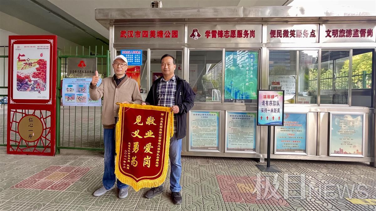 10月9日上午,获救游客赵女士家属来到公园,赠送写有“见义勇为”锦旗以示谢意。