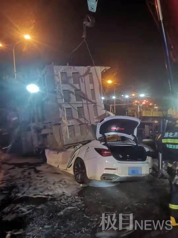 10月8日凌晨,在武汉市硚口区蓝焰物流门口,发生一起车祸。一辆小轿车被一辆侧翻的渣土车压瘪车厢,幸运的是,在救援人员帮助下,小轿车司机得以脱困,未造成人员伤亡。