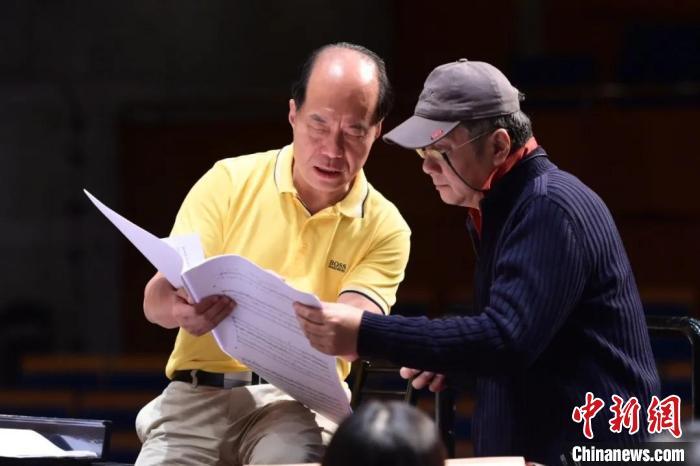 指挥张国勇(左)和作曲家邹野(右)在排练中 北京国际音乐节供图