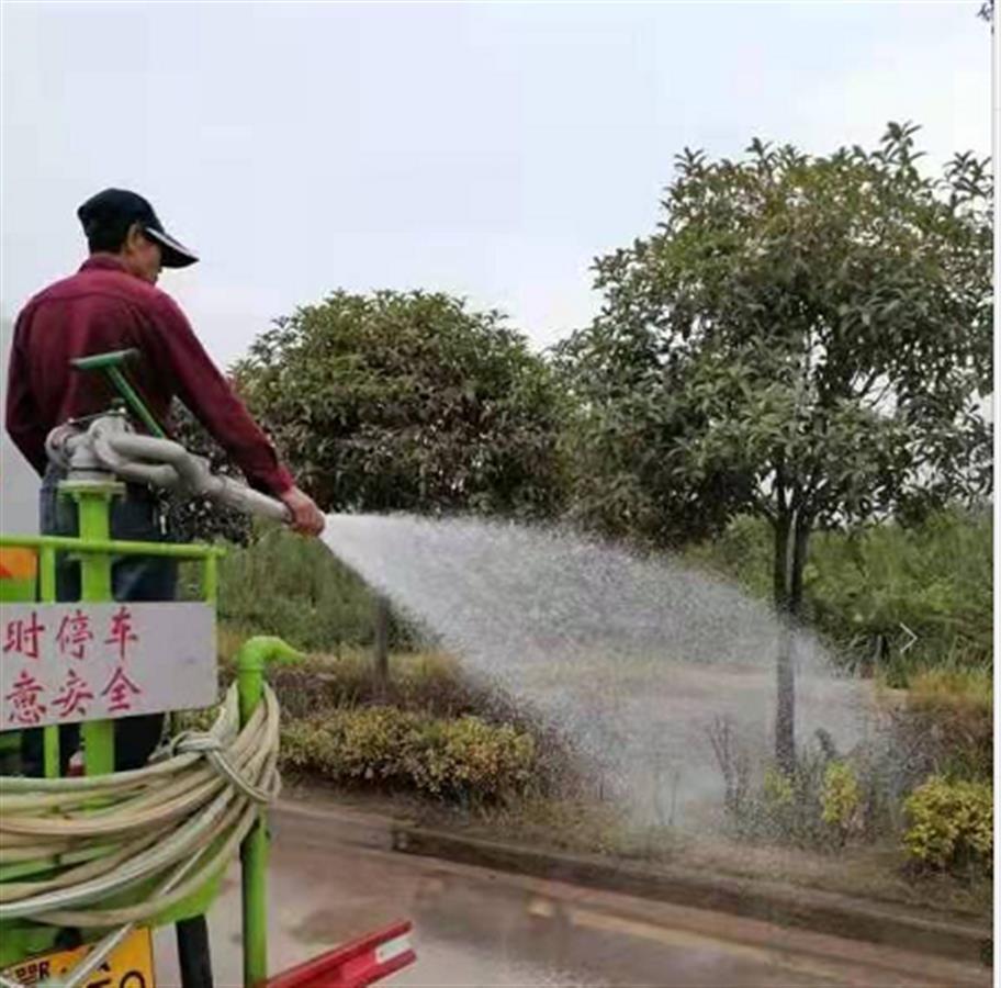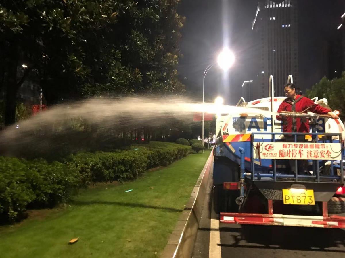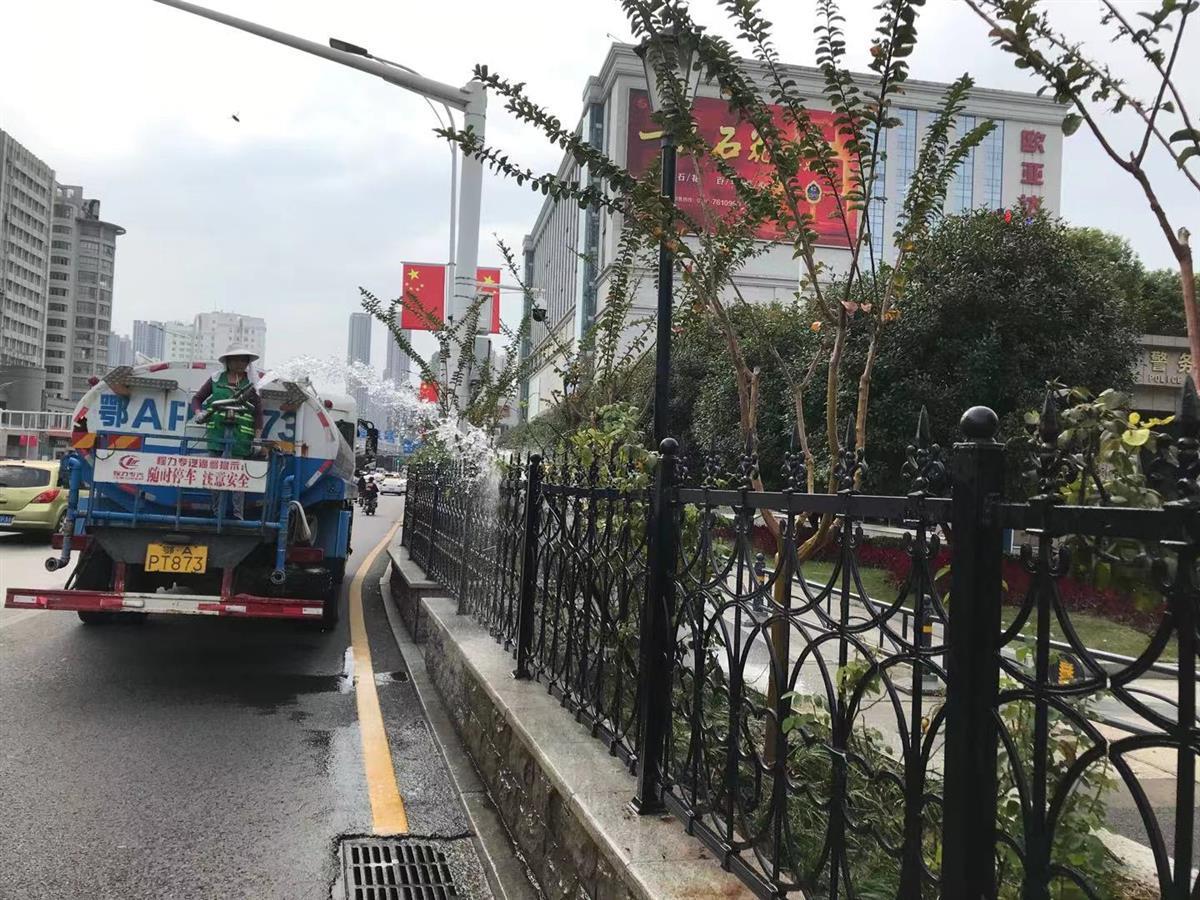 9日下午,洪山区绿化队工作人员在给植物浇水
