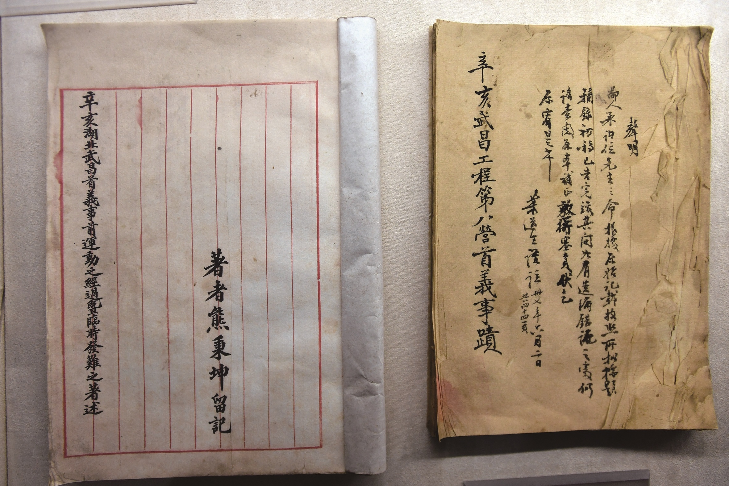 3号展厅的玻璃柜中,有一件首义元勋熊秉坤所著的文稿——《辛亥湖北武昌首义事前运动之经过暨临时发难之著述》稿本。这是由熊秉坤口述,请人记录的,分“湖北革命之起源及其经过之情形”“工八营首先发难暨事前布置”等7个章节,纸张为十行纸,墨书,共38页,详细记述了当时工八营历史及武昌起义经过,是研究辛亥革命武昌起义的珍贵历史文献。
