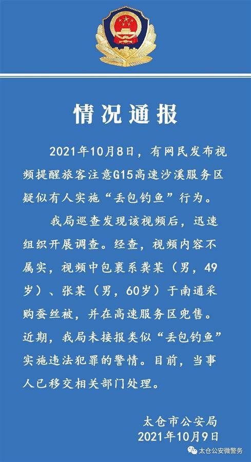 10月9日,太仓市公安局发布通报称,10月9日,网传视频称“G15高速沙溪服务区疑似有人实施‘丢包钓鱼’行为”。 经太仓市公安局核查,视频内容不属实。 视频中包裹系龚某(男,49岁)、张某(男,60岁)于南通采购蚕丝被,并在高速服务区兜售。近期,太仓市公安局未接报类似“丢包钓鱼”实施违法犯罪的警情。目前,当事人已移交相关部门处理。
