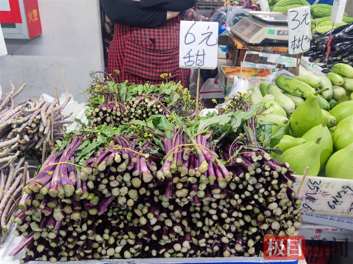 在武汉光谷新竹路集贸市场,出售红菜薹的摊上都插有“6元·甜”的标签。据了解,市场内出售的红菜薹主要来自武汉及周边地区,出售已有几天。