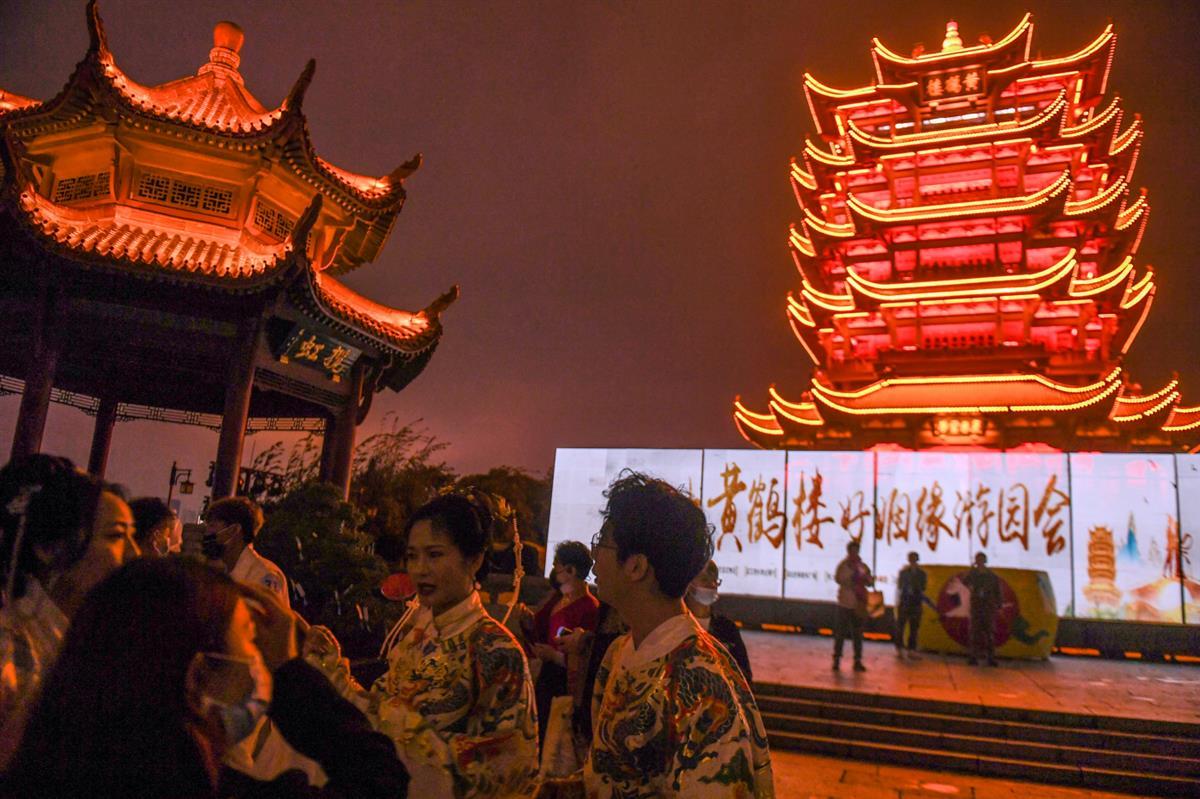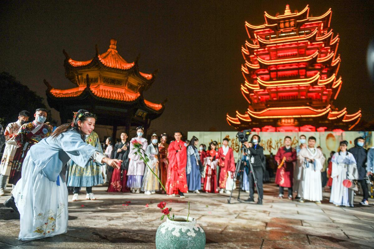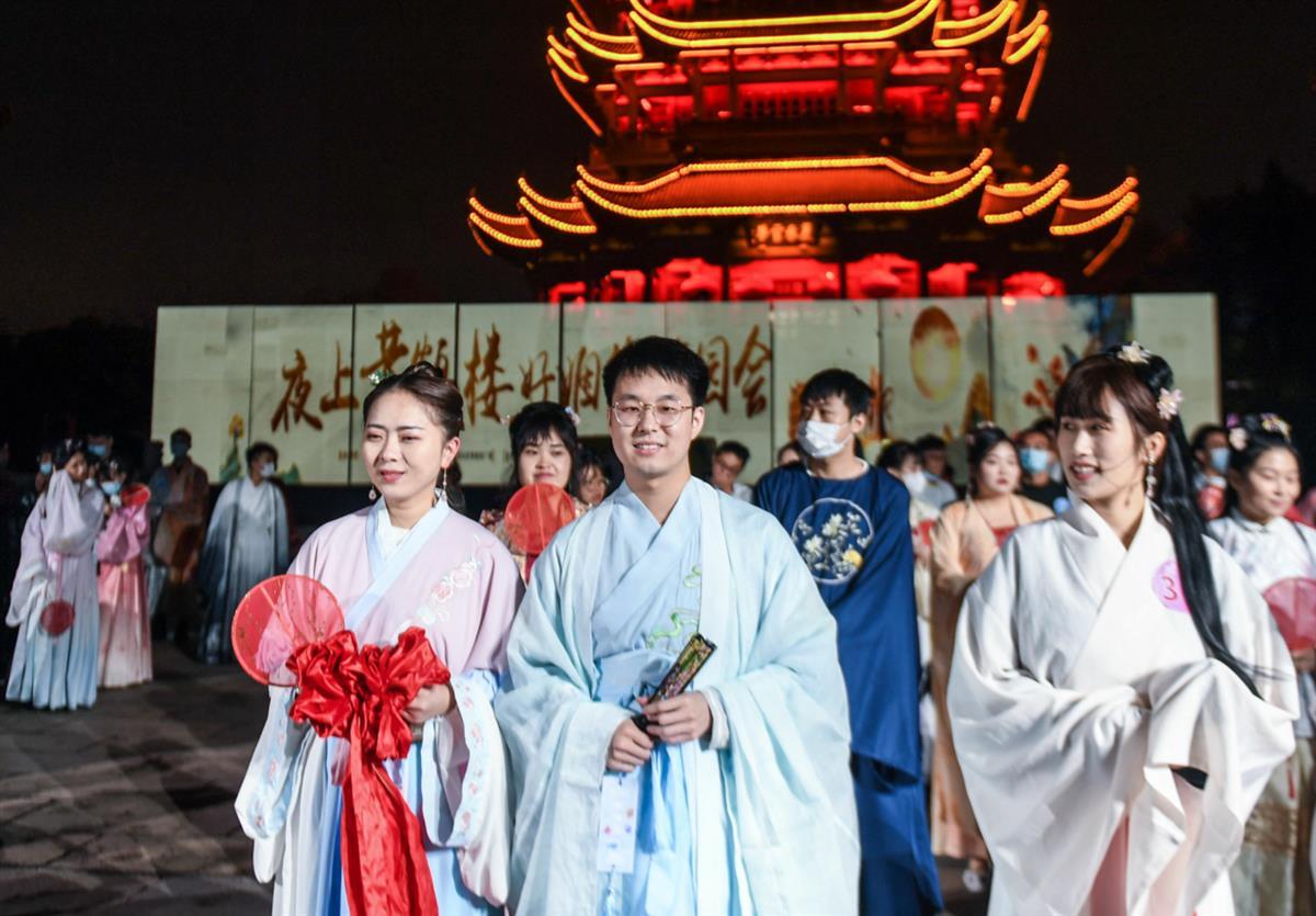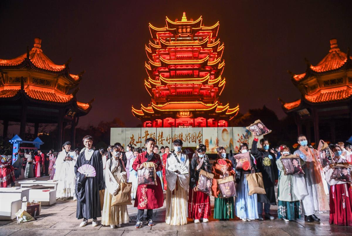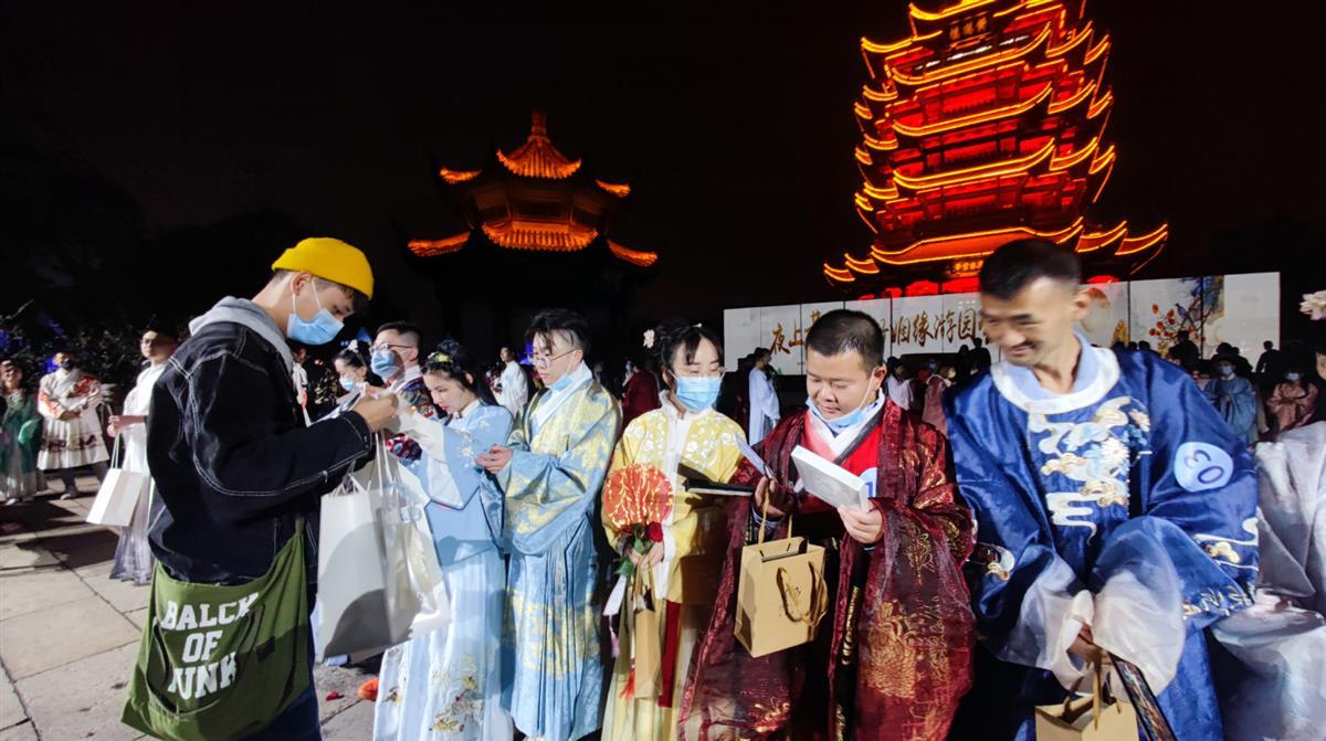 10月10日晚,黄鹤楼夜游携手共青团武汉市委、湖北经典音乐广播,在黄鹤楼公园举办“好姻缘游园会”。活动定向邀约武汉农村商业银行、国网湖北送变电工程有限公司、同济医院等单位职工参与,在千年名楼之下,光影特效之中,数百名嘉宾深度体验汉服游园活动,看一场光影大秀,收获一场独特的缘分。