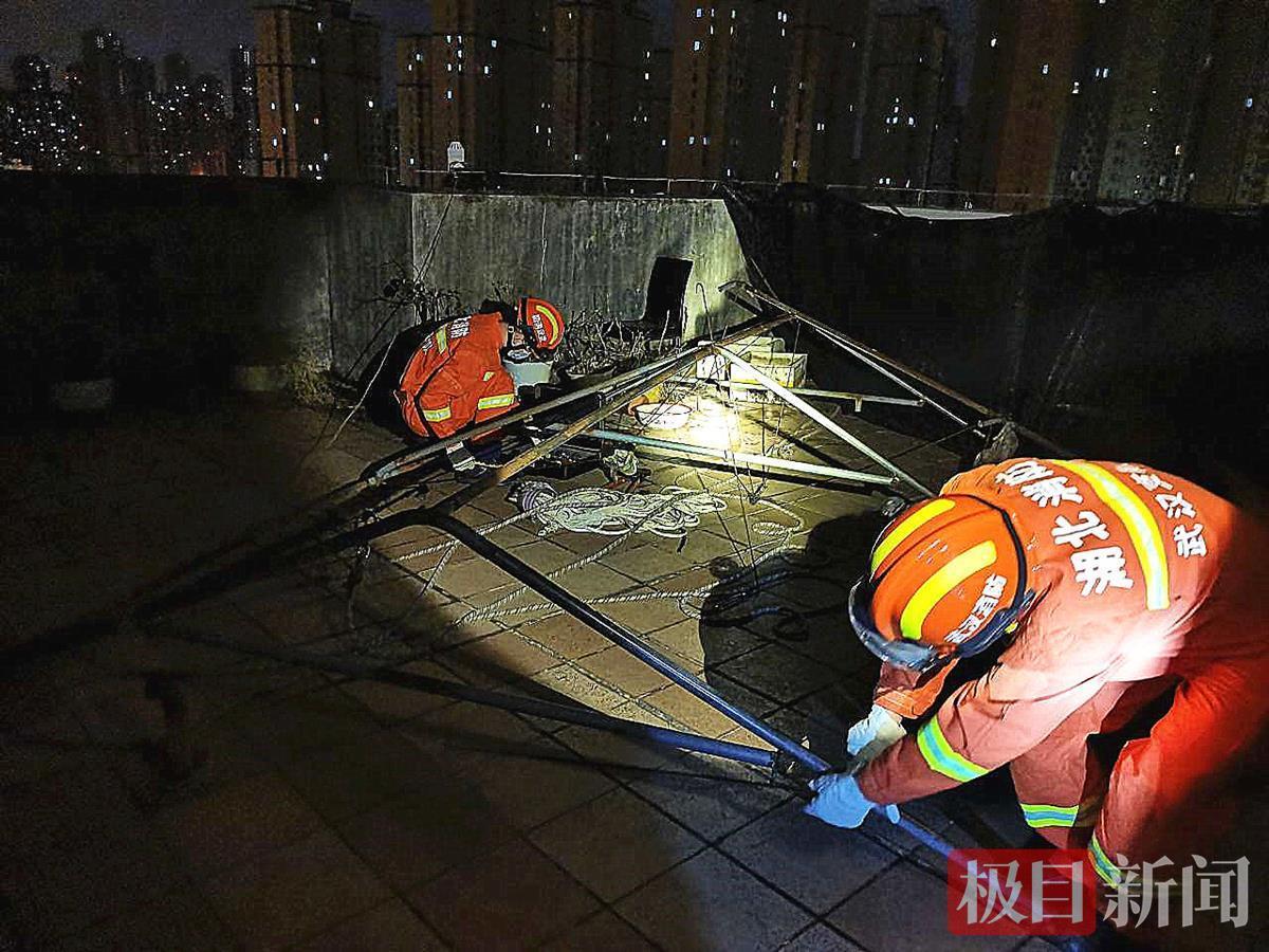 报警人詹爹爹介绍,这个钢结构遮阳棚有100多斤,是用来给楼顶菜地遮阳的,当晚他在家听到顶楼有异响,便上去查看,发现棚子被吹到外墙上挂着,詹爹爹找来物业人员想合力将其拉进来,但棚子太重拉不动,随后想到拨打119请求消防员帮忙。