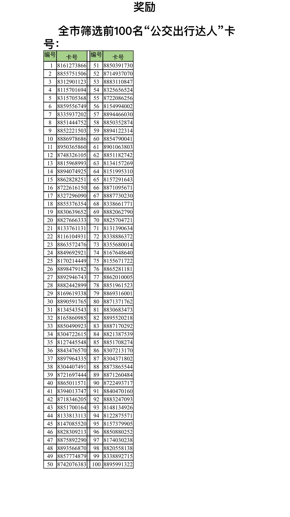这100名“公交出行达人”,是在武汉城市一卡通有限公司协助支持下,通过大数据筛选出的2020年9月1日--2021年8月31日期间,使用一卡通乘坐公共交通金额最多的前100名乘客。为感谢他们一年来为武汉绿色出行和生态文明做出的贡献,给予每人充值奖励100元。